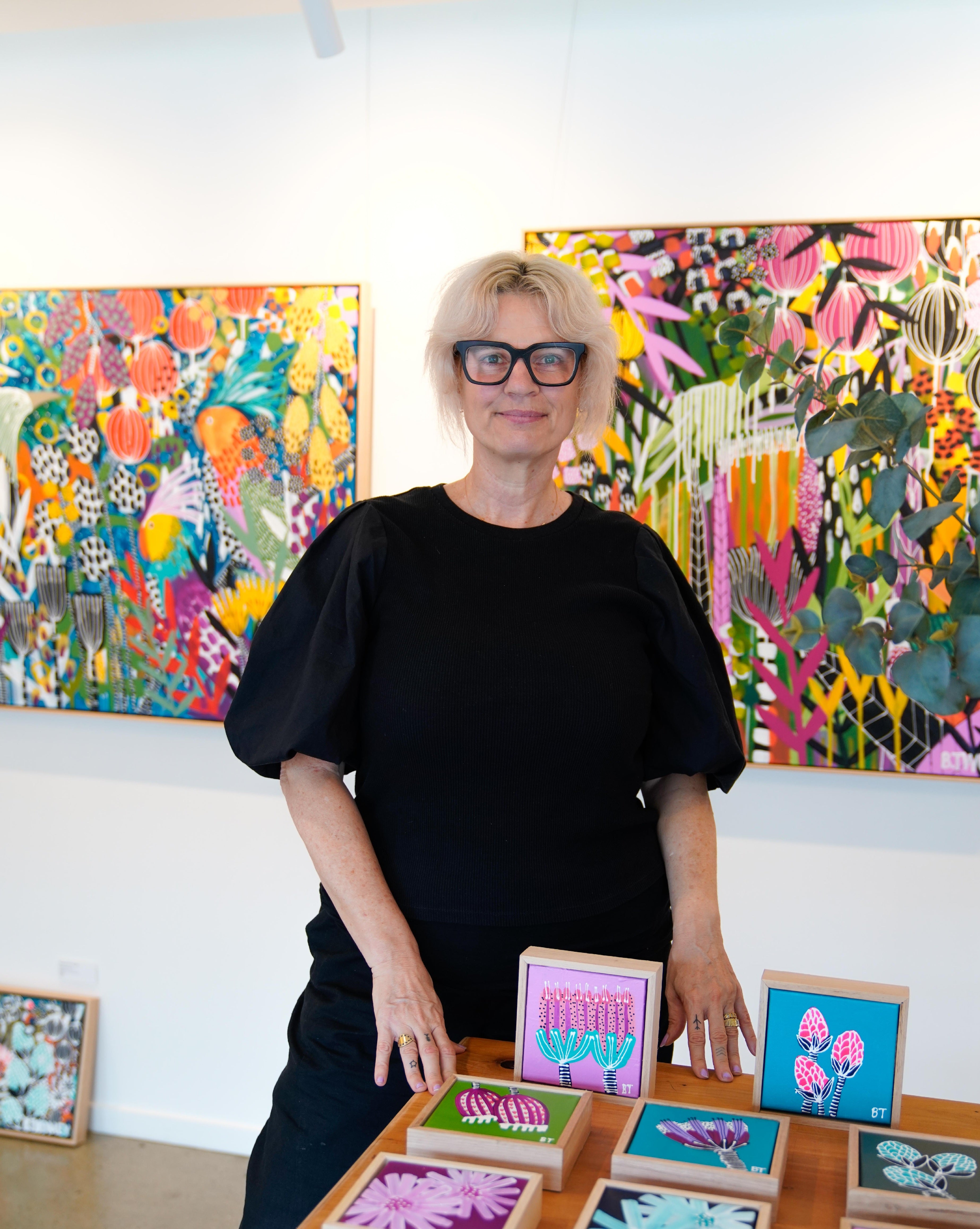 B Twomey is an Australian abstract artist known for her bold, expressive paintings that celebrate colour, movement and emotion. Working from her Brisbane studio, she creates large-scale canvases layered with rich textures and vibrant palettes that evoke mood and seasonal shifts. Her work draws on the energy of the Australian landscape, translating light, heat and atmosphere into striking abstract forms.