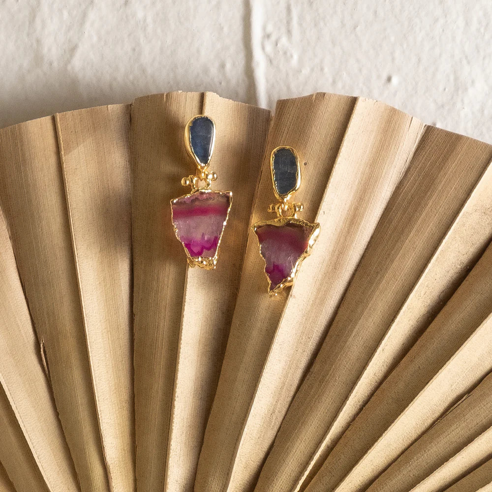 Each is unique - crafted according to the shape of the individual stone. Each handworked item has a brass base with an 18k gold plating. The stones range from beautiful turquoise to brightly coloured dyed quartz.